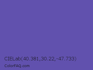 CIELab 40.381,30.22,-47.733 Color is a normal indigo color and the nearest color is Blue Violet #6456b7. Hex code #6151ae and RGB value is rgb(97,81,174). In RGB color space, this color is composed of 38% red, 32% green, 68% blue, In CMYK color space, this color is composed of 44% cyan, 53% magenta, 0% yellow , 32% black , In HSL color space, this color has a hue angle of 250° , 36% saturation and 50% lightness.