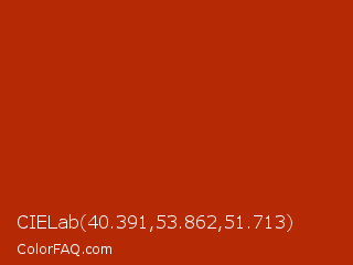 CIELab 40.391,53.862,51.713 Color is a normal red color and the nearest color is Rufous #a81c07. Hex code #b52a04 and RGB value is rgb(181,42,4). In RGB color space, this color is composed of 71% red, 16% green, 2% blue, In CMYK color space, this color is composed of 0% cyan, 77% magenta, 98% yellow , 29% black , In HSL color space, this color has a hue angle of 13° , 96% saturation and 36% lightness.