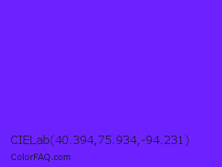 CIELab 40.394,75.934,-94.231 Color is a normal indigo color and the nearest color is Han Purple #5218fa. Hex code #6b22ff and RGB value is rgb(107,34,255). In RGB color space, this color is composed of 42% red, 13% green, 100% blue, In CMYK color space, this color is composed of 58% cyan, 87% magenta, 0% yellow , 0% black , In HSL color space, this color has a hue angle of 260° , 100% saturation and 57% lightness.