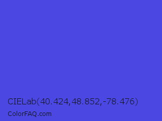 CIELab 40.424,48.852,-78.476 Color is a normal indigo color and the nearest color is Majorelle Blue #6050dc. Hex code #4a47e3 and RGB value is rgb(74,71,227). In RGB color space, this color is composed of 29% red, 28% green, 89% blue, In CMYK color space, this color is composed of 67% cyan, 69% magenta, 0% yellow , 11% black , In HSL color space, this color has a hue angle of 241° , 74% saturation and 58% lightness.
