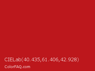 CIELab 40.435,61.406,42.928 Color is a normal red color and the nearest color is Carnelian #b31b1b. Hex code #bd171c and RGB value is rgb(189,23,28). In RGB color space, this color is composed of 74% red, 9% green, 11% blue, In CMYK color space, this color is composed of 0% cyan, 88% magenta, 85% yellow , 26% black , In HSL color space, this color has a hue angle of 358° , 78% saturation and 42% lightness.