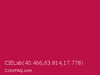 CIELab 40.466,63.814,17.778 Color is a normal rose color and the nearest color is Pictorial Carmine #c30b4e. Hex code #bc1146 and RGB value is rgb(188,17,70). In RGB color space, this color is composed of 74% red, 7% green, 27% blue, In CMYK color space, this color is composed of 0% cyan, 91% magenta, 63% yellow , 26% black , In HSL color space, this color has a hue angle of 341° , 83% saturation and 40% lightness.