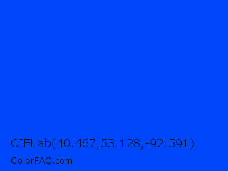 CIELab 40.467,53.128,-92.591 Color is a normal blue color and the nearest color is Blue RYB #0247fe. Hex code #0047fc and RGB value is rgb(0,71,252). In RGB color space, this color is composed of 0% red, 28% green, 99% blue, In CMYK color space, this color is composed of 100% cyan, 72% magenta, 0% yellow , 1% black , In HSL color space, this color has a hue angle of 223° , 100% saturation and 49% lightness.