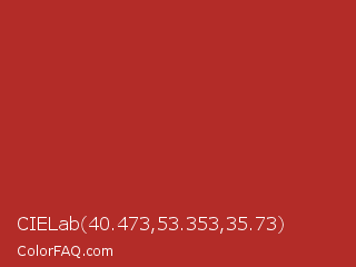 CIELab 40.473,53.353,35.73 Color is a normal red color and the nearest color is Tall Poppy #b32d29. Hex code #b32c28 and RGB value is rgb(179,44,40). In RGB color space, this color is composed of 70% red, 17% green, 16% blue, In CMYK color space, this color is composed of 0% cyan, 75% magenta, 78% yellow , 30% black , In HSL color space, this color has a hue angle of 2° , 63% saturation and 43% lightness.