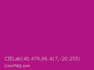 CIELab 40.479,66.417,-20.255 Color is a normal magenta color and the nearest color is Red Violet #c71585. Hex code #b21382 and RGB value is rgb(178,19,130). In RGB color space, this color is composed of 70% red, 7% green, 51% blue, In CMYK color space, this color is composed of 0% cyan, 89% magenta, 27% yellow , 30% black , In HSL color space, this color has a hue angle of 318° , 81% saturation and 39% lightness.