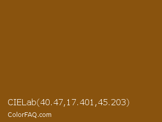 CIELab 40.47,17.401,45.203 Color is a dark orange color and the nearest color is Rusty Nail #86560a. Hex code #89530e and RGB value is rgb(137,83,14). In RGB color space, this color is composed of 54% red, 33% green, 5% blue, In CMYK color space, this color is composed of 0% cyan, 39% magenta, 90% yellow , 46% black , In HSL color space, this color has a hue angle of 34° , 81% saturation and 30% lightness.