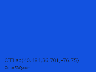 CIELab 40.484,36.701,-76.75 Color is a normal blue color and the nearest color is New Car #214fc6. Hex code #1252e0 and RGB value is rgb(18,82,224). In RGB color space, this color is composed of 7% red, 32% green, 88% blue, In CMYK color space, this color is composed of 92% cyan, 63% magenta, 0% yellow , 12% black , In HSL color space, this color has a hue angle of 221° , 85% saturation and 47% lightness.
