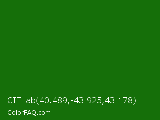 CIELab 40.489,-43.925,43.178 Color is a dark green color and the nearest color is Japanese Laurel #0a6906. Hex code #156f09 and RGB value is rgb(21,111,9). In RGB color space, this color is composed of 8% red, 44% green, 4% blue, In CMYK color space, this color is composed of 81% cyan, 0% magenta, 92% yellow , 56% black , In HSL color space, this color has a hue angle of 113° , 85% saturation and 24% lightness.