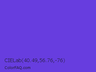 CIELab 40.49,56.76,-76 Color is a normal indigo color and the nearest color is Majorelle Blue #6050dc. Hex code #673ddf and RGB value is rgb(103,61,223). In RGB color space, this color is composed of 40% red, 24% green, 87% blue, In CMYK color space, this color is composed of 54% cyan, 73% magenta, 0% yellow , 13% black , In HSL color space, this color has a hue angle of 256° , 72% saturation and 56% lightness.