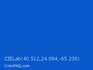 CIELab 40.512,24.094,-65.239 Color is a normal blue color and the nearest color is Science Blue #0066cc. Hex code #0959cc and RGB value is rgb(9,89,204). In RGB color space, this color is composed of 4% red, 35% green, 80% blue, In CMYK color space, this color is composed of 96% cyan, 56% magenta, 0% yellow , 20% black , In HSL color space, this color has a hue angle of 215° , 92% saturation and 42% lightness.
