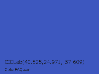 CIELab 40.525,24.971,-57.609 Color is a normal blue color and the nearest color is Cerulean Blue #2a52be. Hex code #3d57bf and RGB value is rgb(61,87,191). In RGB color space, this color is composed of 24% red, 34% green, 75% blue, In CMYK color space, this color is composed of 68% cyan, 54% magenta, 0% yellow , 25% black , In HSL color space, this color has a hue angle of 228° , 52% saturation and 49% lightness.