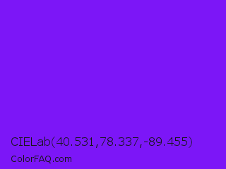 CIELab 40.531,78.337,-89.455 Color is a normal violet color and the nearest color is Violet Color Wheel #7f00ff. Hex code #7c16f7 and RGB value is rgb(124,22,247). In RGB color space, this color is composed of 49% red, 9% green, 97% blue, In CMYK color space, this color is composed of 50% cyan, 91% magenta, 0% yellow , 3% black , In HSL color space, this color has a hue angle of 267° , 93% saturation and 53% lightness.