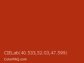 CIELab 40.533,52.03,47.599 Color is a normal red color and the nearest color is Thunderbird #c02b18. Hex code #b32e10 and RGB value is rgb(179,46,16). In RGB color space, this color is composed of 70% red, 18% green, 6% blue, In CMYK color space, this color is composed of 0% cyan, 74% magenta, 91% yellow , 30% black , In HSL color space, this color has a hue angle of 11° , 84% saturation and 38% lightness.