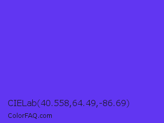 CIELab 40.558,64.49,-86.69 Color is a normal indigo color and the nearest color is Majorelle Blue #6050dc. Hex code #6136f2 and RGB value is rgb(97,54,242). In RGB color space, this color is composed of 38% red, 21% green, 95% blue, In CMYK color space, this color is composed of 60% cyan, 78% magenta, 0% yellow , 5% black , In HSL color space, this color has a hue angle of 254° , 88% saturation and 58% lightness.