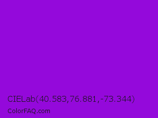 CIELab 40.583,76.881,-73.344 Color is a normal purple color and the nearest color is Dark Violet #9400d3. Hex code #9409db and RGB value is rgb(148,9,219). In RGB color space, this color is composed of 58% red, 4% green, 86% blue, In CMYK color space, this color is composed of 32% cyan, 96% magenta, 0% yellow , 14% black , In HSL color space, this color has a hue angle of 280° , 92% saturation and 45% lightness.
