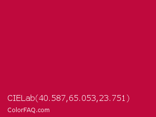 CIELab 40.587,65.053,23.751 Color is a normal rose color and the nearest color is Red NCS #c40233. Hex code #bf093d and RGB value is rgb(191,9,61). In RGB color space, this color is composed of 75% red, 4% green, 24% blue, In CMYK color space, this color is composed of 0% cyan, 95% magenta, 68% yellow , 25% black , In HSL color space, this color has a hue angle of 343° , 91% saturation and 39% lightness.