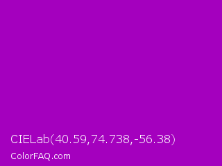 CIELab 40.59,74.738,-56.38 Color is a normal magenta color and the nearest color is Heliotrope Magenta #aa00bb. Hex code #a400be and RGB value is rgb(164,0,190). In RGB color space, this color is composed of 64% red, 0% green, 75% blue, In CMYK color space, this color is composed of 14% cyan, 100% magenta, 0% yellow , 25% black , In HSL color space, this color has a hue angle of 292° , 100% saturation and 37% lightness.