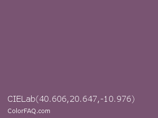 CIELab 40.606,20.647,-10.976 Color is a normal magenta color and the nearest color is Falcon #7f626d. Hex code #795472 and RGB value is rgb(121,84,114). In RGB color space, this color is composed of 47% red, 33% green, 45% blue, In CMYK color space, this color is composed of 0% cyan, 31% magenta, 6% yellow , 53% black , In HSL color space, this color has a hue angle of 311° , 18% saturation and 40% lightness.
