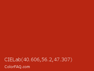 CIELab 40.606,56.2,47.307 Color is a normal red color and the nearest color is Thunderbird #c02b18. Hex code #b82612 and RGB value is rgb(184,38,18). In RGB color space, this color is composed of 72% red, 15% green, 7% blue, In CMYK color space, this color is composed of 0% cyan, 79% magenta, 90% yellow , 28% black , In HSL color space, this color has a hue angle of 7° , 82% saturation and 40% lightness.