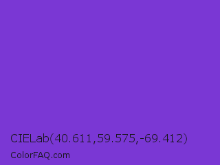 CIELab 40.611,59.575,-69.412 Color is a normal violet color and the nearest color is Blue Violet #8a2be2. Hex code #7a37d4 and RGB value is rgb(122,55,212). In RGB color space, this color is composed of 48% red, 22% green, 83% blue, In CMYK color space, this color is composed of 42% cyan, 74% magenta, 0% yellow , 17% black , In HSL color space, this color has a hue angle of 266° , 65% saturation and 52% lightness.
