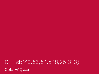 CIELab 40.63,64.548,26.313 Color is a normal red color and the nearest color is Red NCS #c40233. Hex code #bf0c39 and RGB value is rgb(191,12,57). In RGB color space, this color is composed of 75% red, 5% green, 22% blue, In CMYK color space, this color is composed of 0% cyan, 94% magenta, 70% yellow , 25% black , In HSL color space, this color has a hue angle of 345° , 88% saturation and 40% lightness.