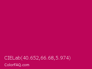 CIELab 40.652,66.68,5.974 Color is a normal rose color and the nearest color is Pictorial Carmine #c30b4e. Hex code #bd0559 and RGB value is rgb(189,5,89). In RGB color space, this color is composed of 74% red, 2% green, 35% blue, In CMYK color space, this color is composed of 0% cyan, 97% magenta, 53% yellow , 26% black , In HSL color space, this color has a hue angle of 333° , 95% saturation and 38% lightness.