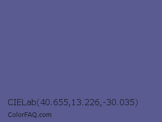 CIELab 40.655,13.226,-30.035 Color is a normal blue color and the nearest color is UCLA Blue #536895. Hex code #595b91 and RGB value is rgb(89,91,145). In RGB color space, this color is composed of 35% red, 36% green, 57% blue, In CMYK color space, this color is composed of 39% cyan, 37% magenta, 0% yellow , 43% black , In HSL color space, this color has a hue angle of 238° , 24% saturation and 46% lightness.