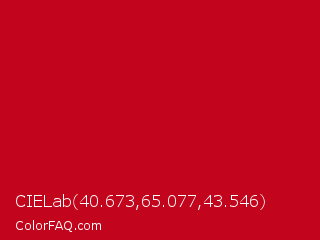 CIELab 40.673,65.077,43.546 Color is a normal red color and the nearest color is Monza #c7031e. Hex code #c2051c and RGB value is rgb(194,5,28). In RGB color space, this color is composed of 76% red, 2% green, 11% blue, In CMYK color space, this color is composed of 0% cyan, 97% magenta, 86% yellow , 24% black , In HSL color space, this color has a hue angle of 353° , 95% saturation and 39% lightness.
