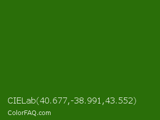 CIELab 40.677,-38.991,43.552 Color is a dark green color and the nearest color is Bilbao #327c14. Hex code #2a6e09 and RGB value is rgb(42,110,9). In RGB color space, this color is composed of 16% red, 43% green, 4% blue, In CMYK color space, this color is composed of 62% cyan, 0% magenta, 92% yellow , 57% black , In HSL color space, this color has a hue angle of 100° , 85% saturation and 23% lightness.
