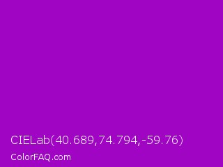 CIELab 40.689,74.794,-59.76 Color is a normal purple color and the nearest color is Purple Munsell #9f00c5. Hex code #a105c4 and RGB value is rgb(161,5,196). In RGB color space, this color is composed of 63% red, 2% green, 77% blue, In CMYK color space, this color is composed of 18% cyan, 97% magenta, 0% yellow , 23% black , In HSL color space, this color has a hue angle of 289° , 95% saturation and 39% lightness.