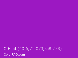 CIELab 40.6,71.073,-58.773 Color is a normal purple color and the nearest color is Purple Munsell #9f00c5. Hex code #9c18c2 and RGB value is rgb(156,24,194). In RGB color space, this color is composed of 61% red, 9% green, 76% blue, In CMYK color space, this color is composed of 20% cyan, 88% magenta, 0% yellow , 24% black , In HSL color space, this color has a hue angle of 287° , 78% saturation and 43% lightness.