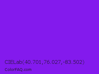 CIELab 40.701,76.027,-83.502 Color is a normal violet color and the nearest color is Blue Violet #8a2be2. Hex code #831aed and RGB value is rgb(131,26,237). In RGB color space, this color is composed of 51% red, 10% green, 93% blue, In CMYK color space, this color is composed of 45% cyan, 89% magenta, 0% yellow , 7% black , In HSL color space, this color has a hue angle of 270° , 85% saturation and 52% lightness.