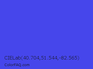 CIELab 40.704,51.544,-82.565 Color is a normal blue color and the nearest color is Majorelle Blue #6050dc. Hex code #4646eb and RGB value is rgb(70,70,235). In RGB color space, this color is composed of 27% red, 27% green, 92% blue, In CMYK color space, this color is composed of 70% cyan, 70% magenta, 0% yellow , 8% black , In HSL color space, this color has a hue angle of 240° , 80% saturation and 60% lightness.