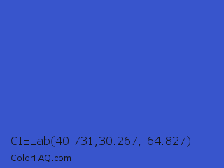 CIELab 40.731,30.267,-64.827 Color is a normal blue color and the nearest color is Cerulean Blue #2a52be. Hex code #3855cc and RGB value is rgb(56,85,204). In RGB color space, this color is composed of 22% red, 33% green, 80% blue, In CMYK color space, this color is composed of 73% cyan, 58% magenta, 0% yellow , 20% black , In HSL color space, this color has a hue angle of 228° , 59% saturation and 51% lightness.