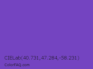 CIELab 40.731,47.284,-58.231 Color is a normal violet color and the nearest color is Studio #714ab2. Hex code #7444c1 and RGB value is rgb(116,68,193). In RGB color space, this color is composed of 45% red, 27% green, 76% blue, In CMYK color space, this color is composed of 40% cyan, 65% magenta, 0% yellow , 24% black , In HSL color space, this color has a hue angle of 263° , 50% saturation and 51% lightness.