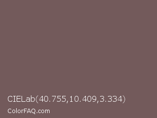 CIELab 40.755,10.409,3.334 Color is a normal red color and the nearest color is Russett #755a57. Hex code #735a5b and RGB value is rgb(115,90,91). In RGB color space, this color is composed of 45% red, 35% green, 36% blue, In CMYK color space, this color is composed of 0% cyan, 22% magenta, 21% yellow , 55% black , In HSL color space, this color has a hue angle of 358° , 12% saturation and 40% lightness.