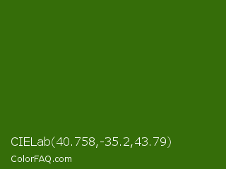CIELab 40.758,-35.2,43.79 Color is a dark green color and the nearest color is Dell #396413. Hex code #356d09 and RGB value is rgb(53,109,9). In RGB color space, this color is composed of 21% red, 43% green, 4% blue, In CMYK color space, this color is composed of 51% cyan, 0% magenta, 92% yellow , 57% black , In HSL color space, this color has a hue angle of 94° , 85% saturation and 23% lightness.