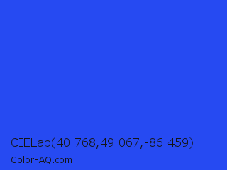 CIELab 40.768,49.067,-86.459 Color is a normal blue color and the nearest color is Palatinate Blue #273be2. Hex code #264af2 and RGB value is rgb(38,74,242). In RGB color space, this color is composed of 15% red, 29% green, 95% blue, In CMYK color space, this color is composed of 84% cyan, 69% magenta, 0% yellow , 5% black , In HSL color space, this color has a hue angle of 229° , 89% saturation and 55% lightness.