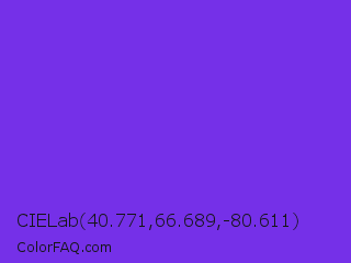 CIELab 40.771,66.689,-80.611 Color is a normal violet color and the nearest color is Blue Violet #8a2be2. Hex code #7530e8 and RGB value is rgb(117,48,232). In RGB color space, this color is composed of 46% red, 19% green, 91% blue, In CMYK color space, this color is composed of 50% cyan, 79% magenta, 0% yellow , 9% black , In HSL color space, this color has a hue angle of 263° , 80% saturation and 55% lightness.