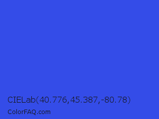 CIELab 40.776,45.387,-80.78 Color is a normal blue color and the nearest color is Palatinate Blue #273be2. Hex code #344ce8 and RGB value is rgb(52,76,232). In RGB color space, this color is composed of 20% red, 30% green, 91% blue, In CMYK color space, this color is composed of 78% cyan, 67% magenta, 0% yellow , 9% black , In HSL color space, this color has a hue angle of 232° , 80% saturation and 56% lightness.