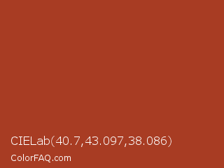 CIELab 40.7,43.097,38.086 Color is a normal red color and the nearest color is Chinese Red #aa381e. Hex code #a83c23 and RGB value is rgb(168,60,35). In RGB color space, this color is composed of 66% red, 24% green, 14% blue, In CMYK color space, this color is composed of 0% cyan, 64% magenta, 79% yellow , 34% black , In HSL color space, this color has a hue angle of 11° , 66% saturation and 40% lightness.