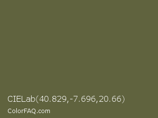 CIELab 40.829,-7.696,20.66 Color is a normal yellow color and the nearest color is Hemlock #5e5d3b. Hex code #60633e and RGB value is rgb(96,99,62). In RGB color space, this color is composed of 38% red, 39% green, 24% blue, In CMYK color space, this color is composed of 3% cyan, 0% magenta, 37% yellow , 61% black , In HSL color space, this color has a hue angle of 65° , 23% saturation and 32% lightness.