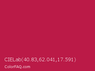 CIELab 40.83,62.041,17.591 Color is a normal rose color and the nearest color is Maroon Flush #c32148. Hex code #bb1a47 and RGB value is rgb(187,26,71). In RGB color space, this color is composed of 73% red, 10% green, 28% blue, In CMYK color space, this color is composed of 0% cyan, 86% magenta, 62% yellow , 27% black , In HSL color space, this color has a hue angle of 343° , 76% saturation and 42% lightness.