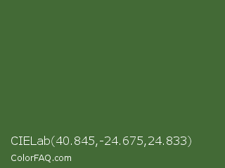 CIELab 40.845,-24.675,24.833 Color is a normal green color and the nearest color is Chalet Green #516e3d. Hex code #436a36 and RGB value is rgb(67,106,54). In RGB color space, this color is composed of 26% red, 42% green, 21% blue, In CMYK color space, this color is composed of 37% cyan, 0% magenta, 49% yellow , 58% black , In HSL color space, this color has a hue angle of 105° , 33% saturation and 31% lightness.