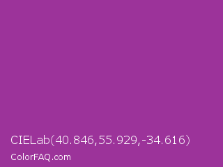CIELab 40.846,55.929,-34.616 Color is a normal magenta color and the nearest color is Vivid Violet #803790. Hex code #9c339a and RGB value is rgb(156,51,154). In RGB color space, this color is composed of 61% red, 20% green, 60% blue, In CMYK color space, this color is composed of 0% cyan, 67% magenta, 1% yellow , 39% black , In HSL color space, this color has a hue angle of 301° , 51% saturation and 41% lightness.
