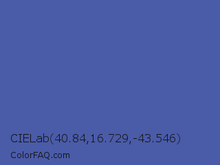 CIELab 40.84,16.729,-43.546 Color is a normal blue color and the nearest color is Liberty #545aa7. Hex code #4a5ba8 and RGB value is rgb(74,91,168). In RGB color space, this color is composed of 29% red, 36% green, 66% blue, In CMYK color space, this color is composed of 56% cyan, 46% magenta, 0% yellow , 34% black , In HSL color space, this color has a hue angle of 229° , 39% saturation and 47% lightness.