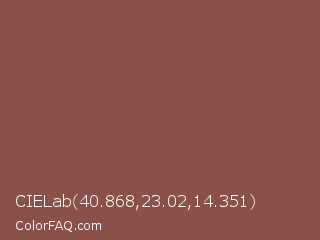 CIELab 40.868,23.02,14.351 Color is a normal red color and the nearest color is Spicy Mix #885342. Hex code #8a514a and RGB value is rgb(138,81,74). In RGB color space, this color is composed of 54% red, 32% green, 29% blue, In CMYK color space, this color is composed of 0% cyan, 41% magenta, 46% yellow , 46% black , In HSL color space, this color has a hue angle of 7° , 30% saturation and 42% lightness.