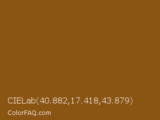 CIELab 40.882,17.418,43.879 Color is a normal orange color and the nearest color is Grizzly #885818. Hex code #8a5413 and RGB value is rgb(138,84,19). In RGB color space, this color is composed of 54% red, 33% green, 7% blue, In CMYK color space, this color is composed of 0% cyan, 39% magenta, 86% yellow , 46% black , In HSL color space, this color has a hue angle of 33° , 76% saturation and 31% lightness.