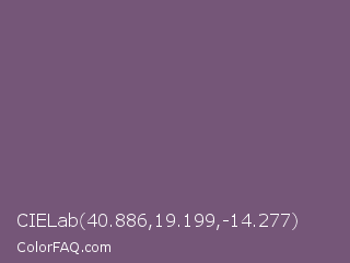 CIELab 40.886,19.199,-14.277 Color is a normal magenta color and the nearest color is Salt Box #685e6e. Hex code #755678 and RGB value is rgb(117,86,120). In RGB color space, this color is composed of 46% red, 34% green, 47% blue, In CMYK color space, this color is composed of 3% cyan, 28% magenta, 0% yellow , 53% black , In HSL color space, this color has a hue angle of 295° , 17% saturation and 40% lightness.