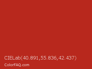CIELab 40.891,55.836,42.437 Color is a normal red color and the nearest color is Firebrick #b22222. Hex code #b8281d and RGB value is rgb(184,40,29). In RGB color space, this color is composed of 72% red, 16% green, 11% blue, In CMYK color space, this color is composed of 0% cyan, 78% magenta, 84% yellow , 28% black , In HSL color space, this color has a hue angle of 4° , 73% saturation and 42% lightness.